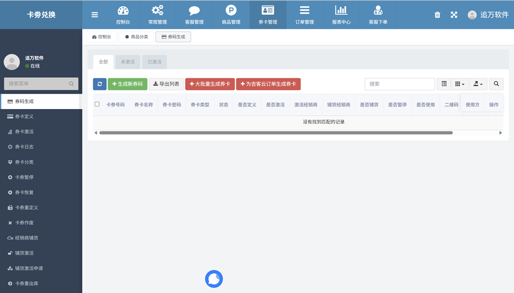 - 卡券生成管理: 支持批量生成兑换码、卡号、密钥,并可导出Excel。
